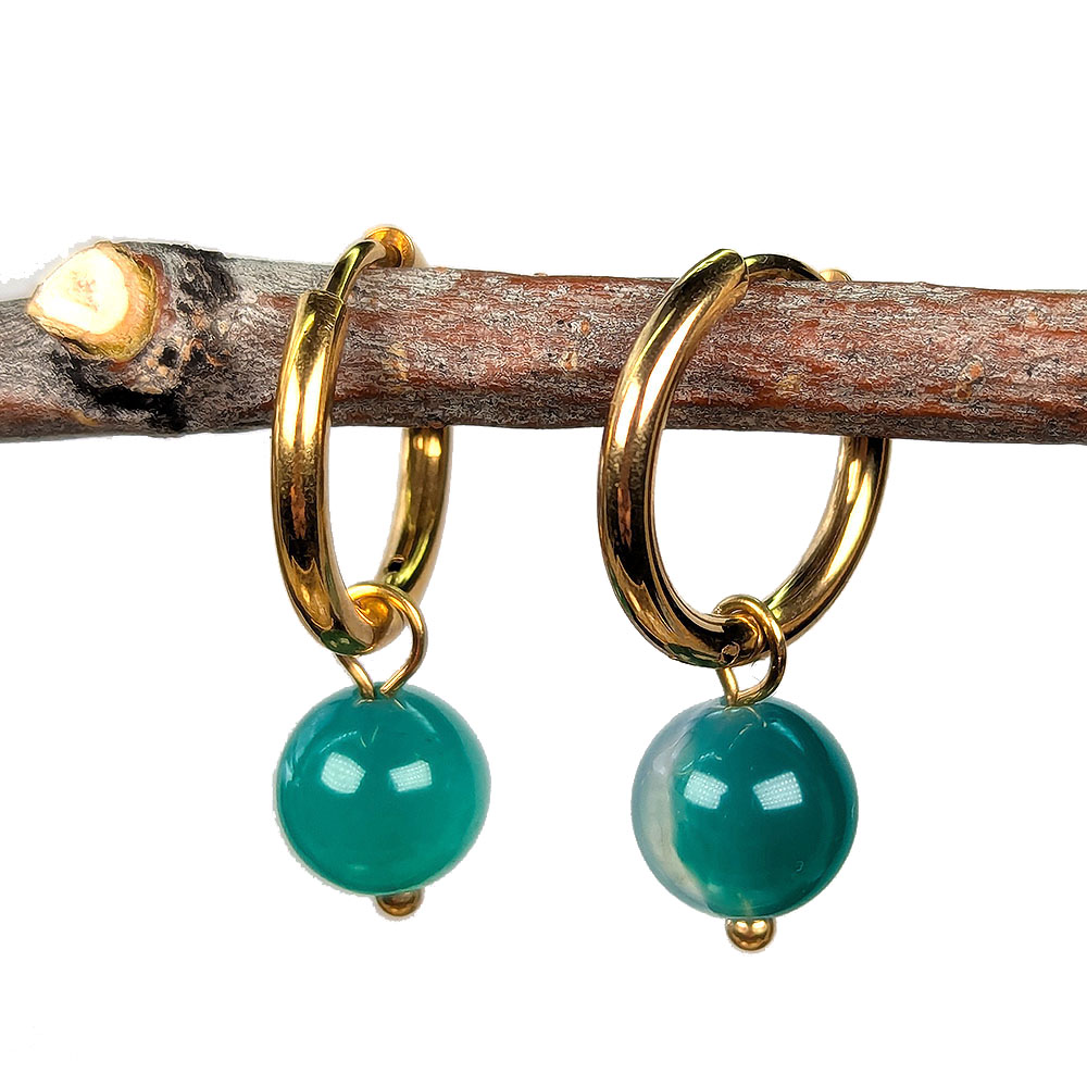 18K Real Gold Plated Stainless Steel Huggie Hoop Green Agate 8mm Gemstone Earrings
