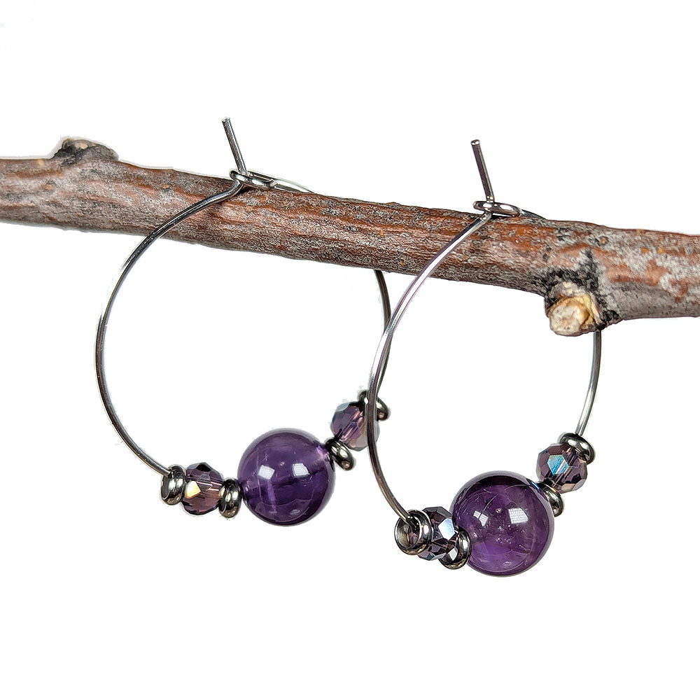 18K Real Gold Plated Stainless Steel Platinum Hoop Purple Crystal Gemstone Earrings