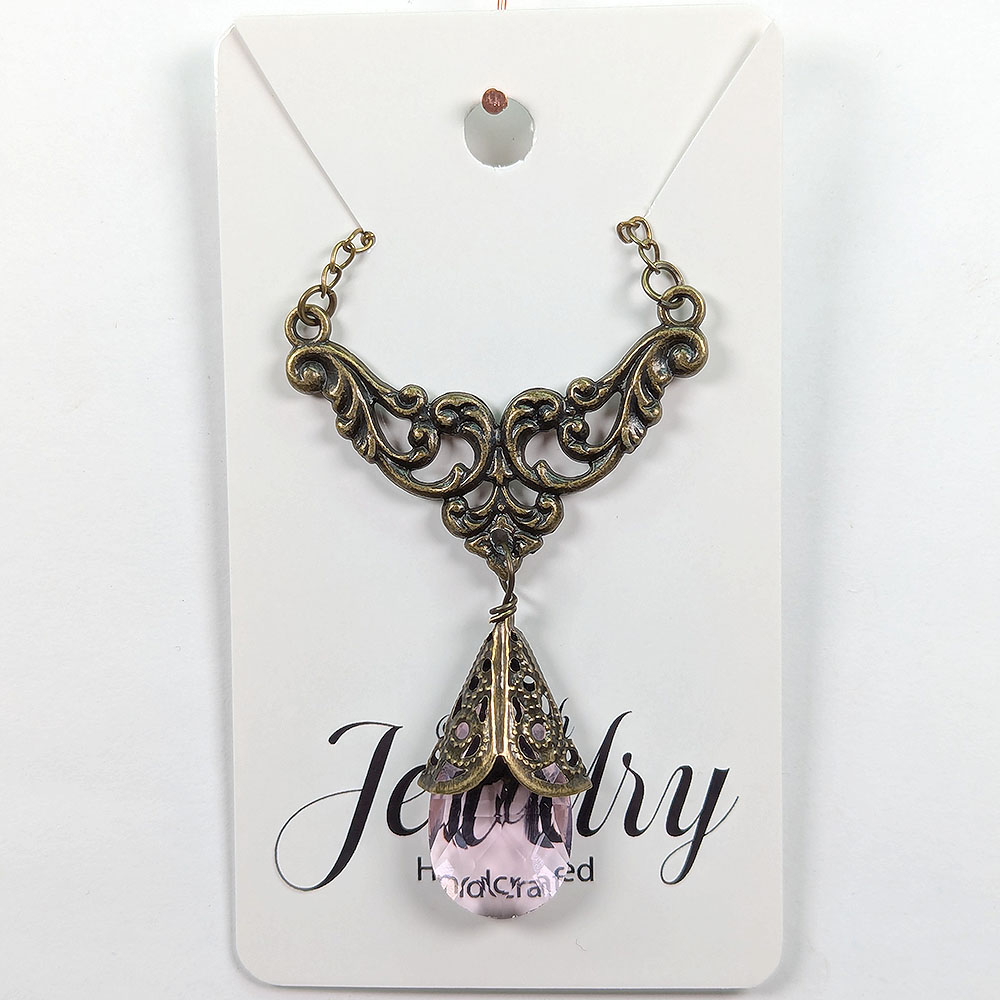 Antique Bronze Pink Teardrop Crystal Drop Vintage Style Necklace