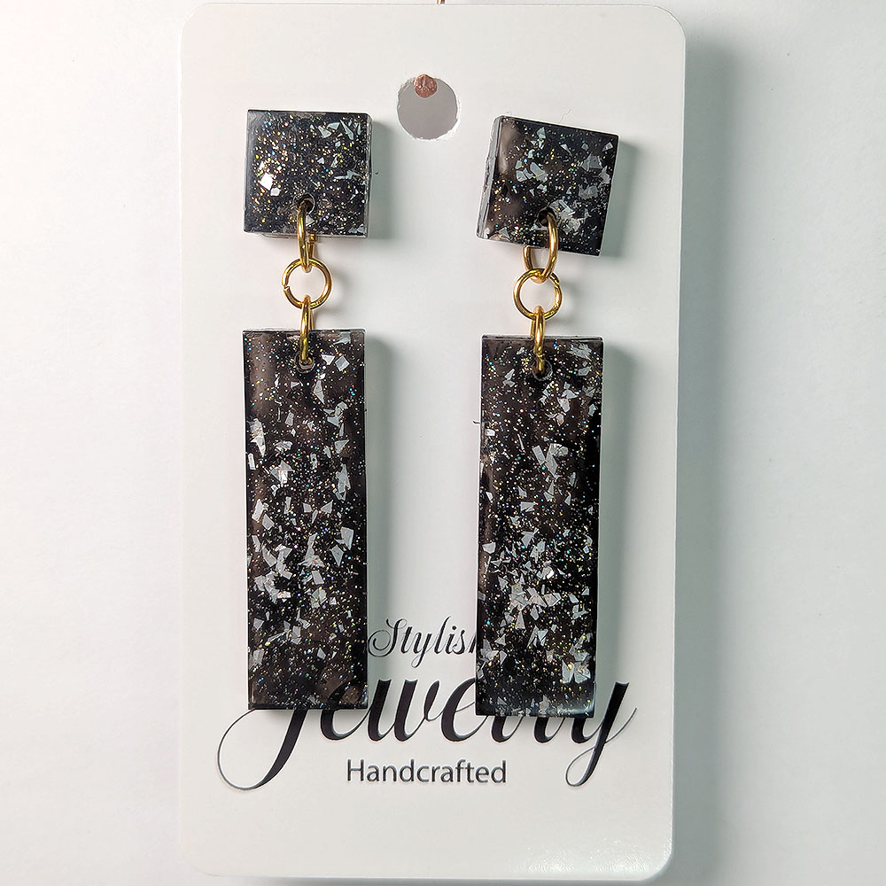 Black Rectangle Silver Flecks Mica Resin With Stud Earrings
