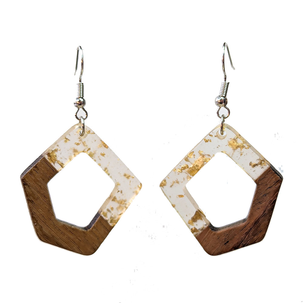 Clear Gold Leaf Resin Wood Hollow Irregular Diamond Earrings