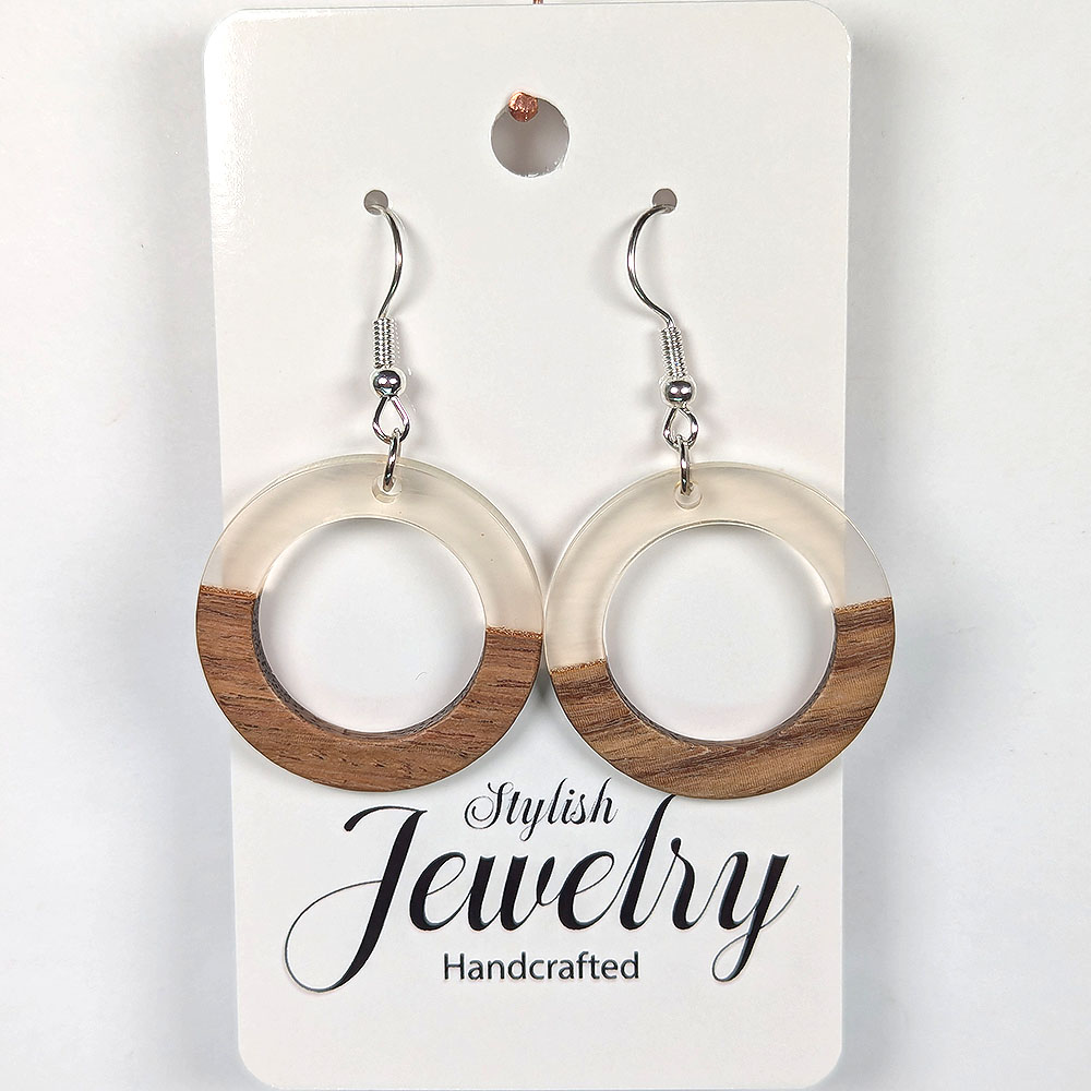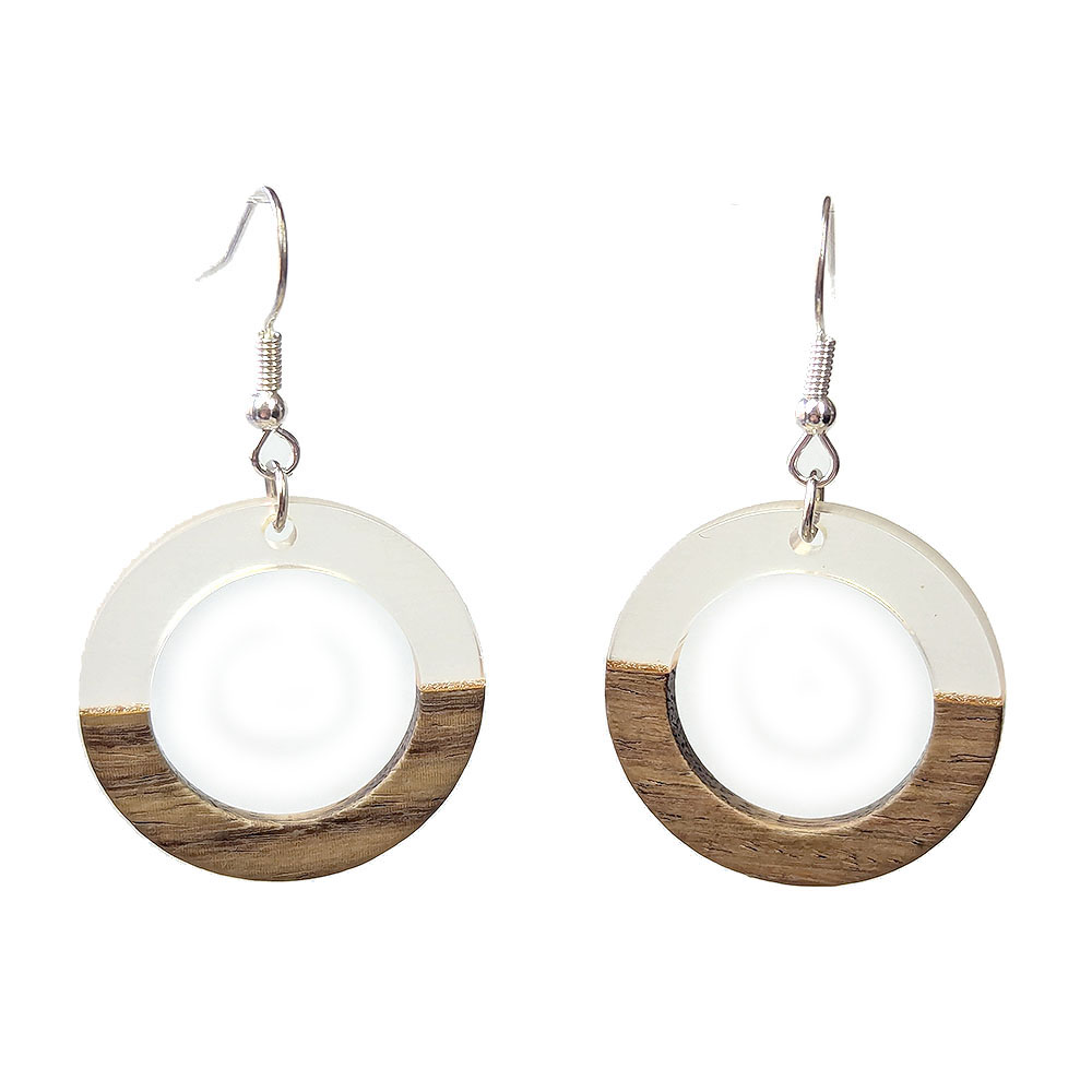 Clear Resin Wood Hollow Round Hoop Silver Earrings