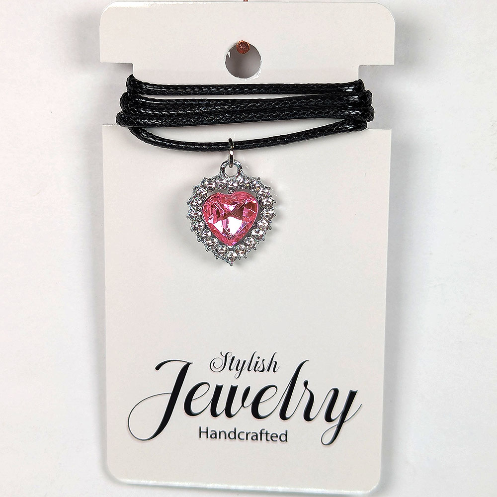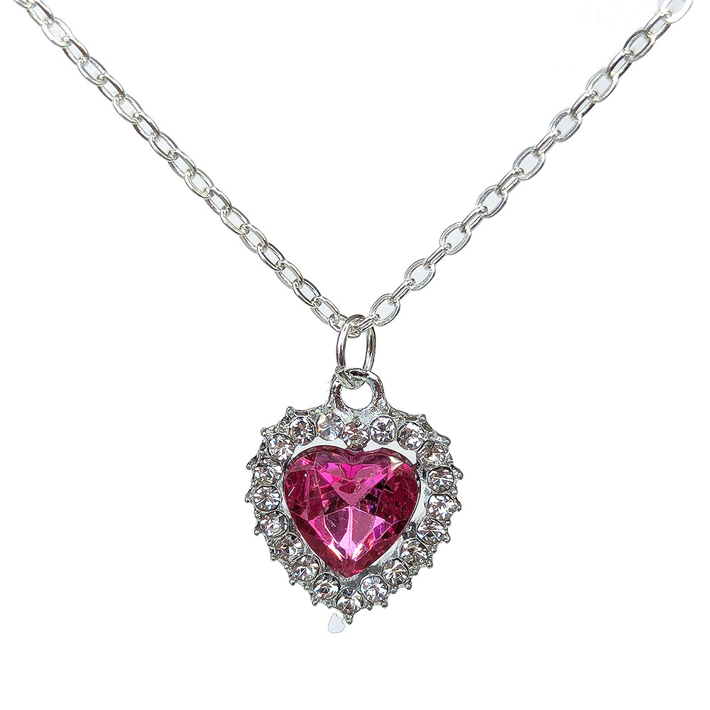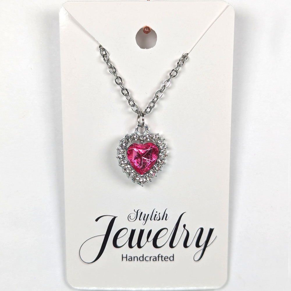 Hot Pink Faceted Clear Rhinestone Heart Necklace Silver