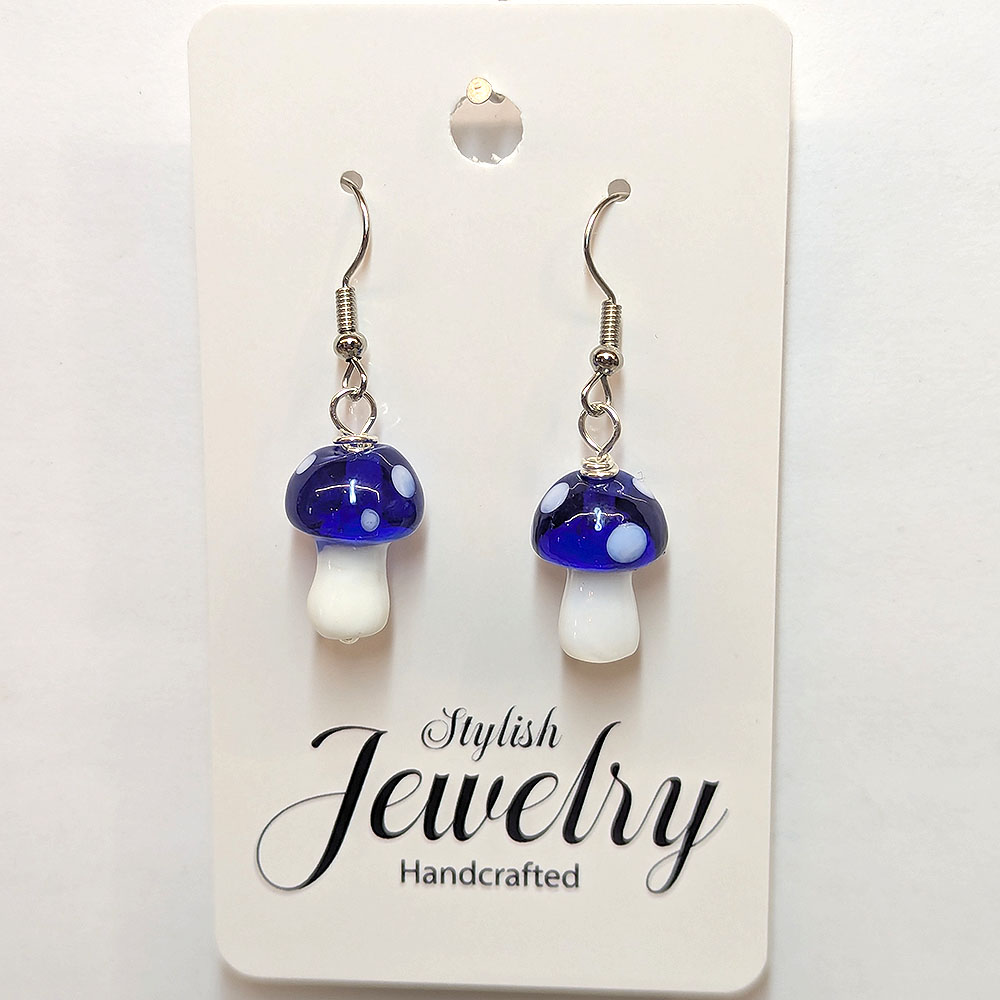 Lampwork Glass Dark Blue Mushroom Silver Earrings