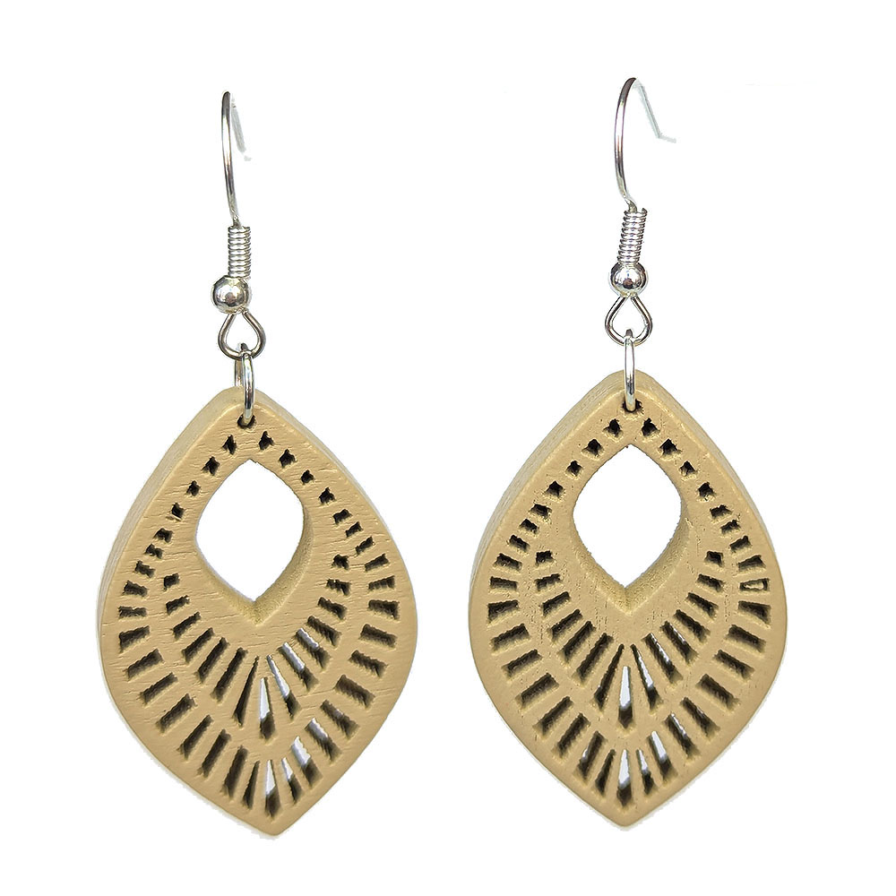 Large Decorative Diamond Wood Pendant Cream Earrings