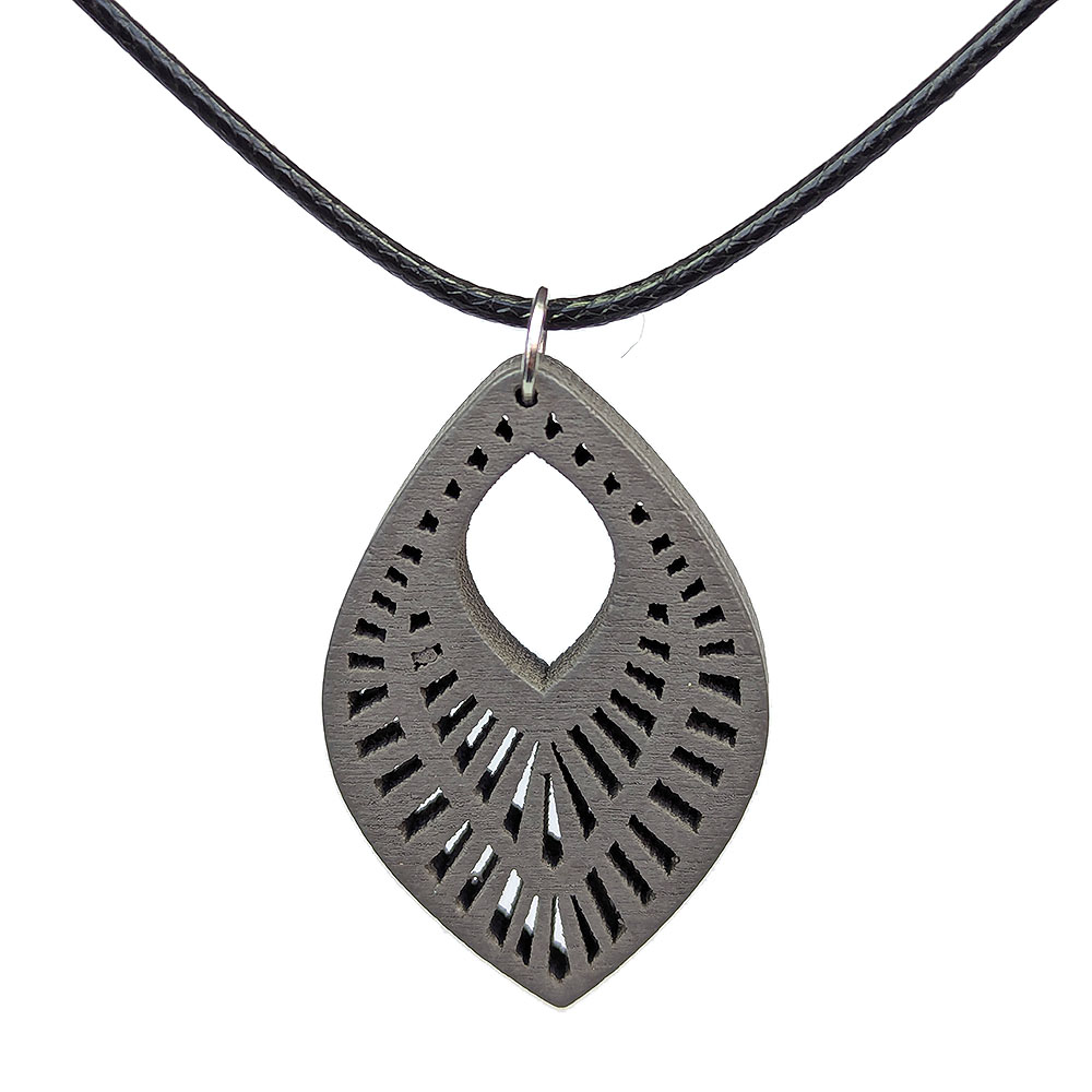 Large Decorative Diamond Wood Pendant Grey Necklace