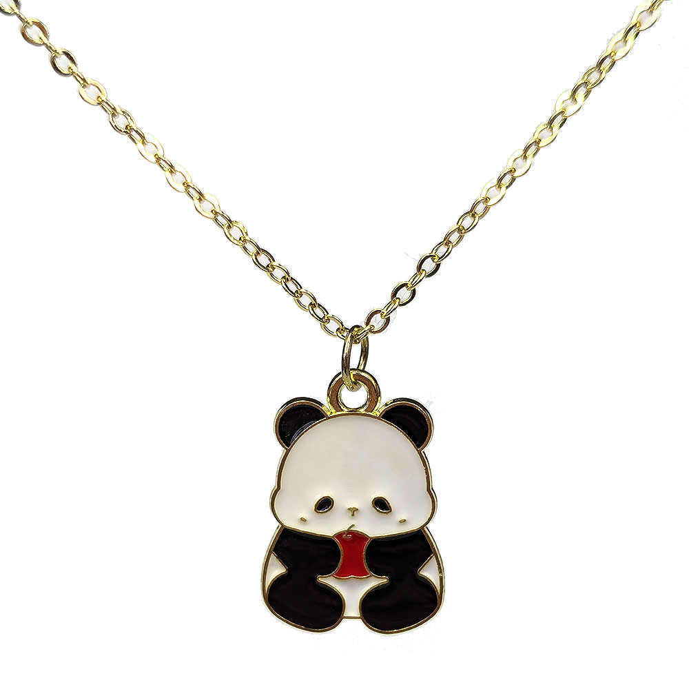 Panda Holding Red Fruit Enamel Charm Necklace Gold