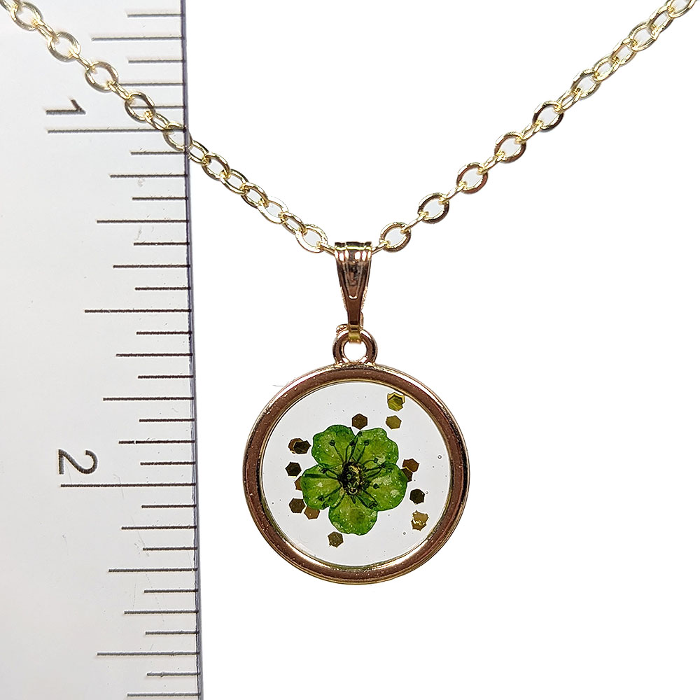 Real Dried Green Flower Glitter Resin Round Necklace Gold