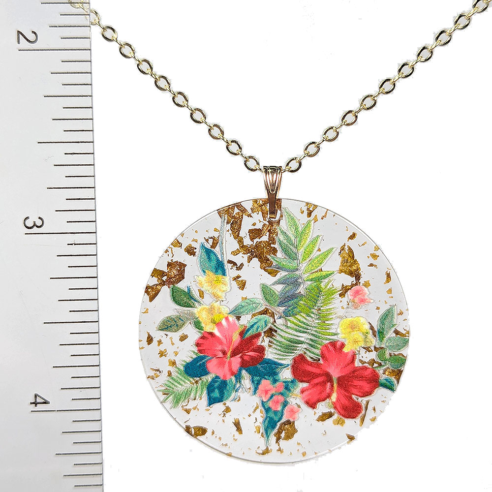 Round Gold Leaf Flowers Decal Resin Pendant Necklace