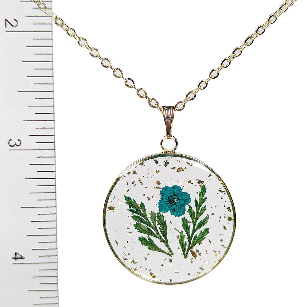 Round Real Blue Flower Fern Gold Leaf Resin Necklace