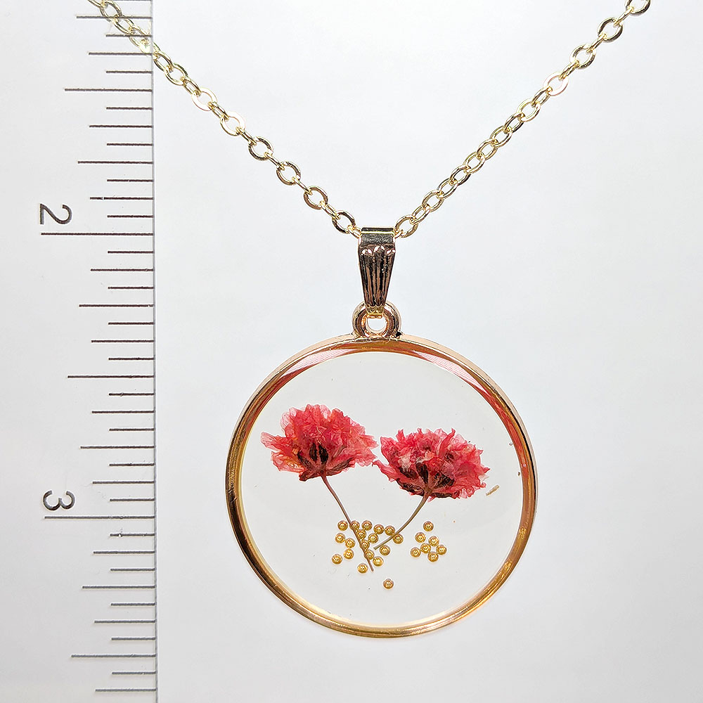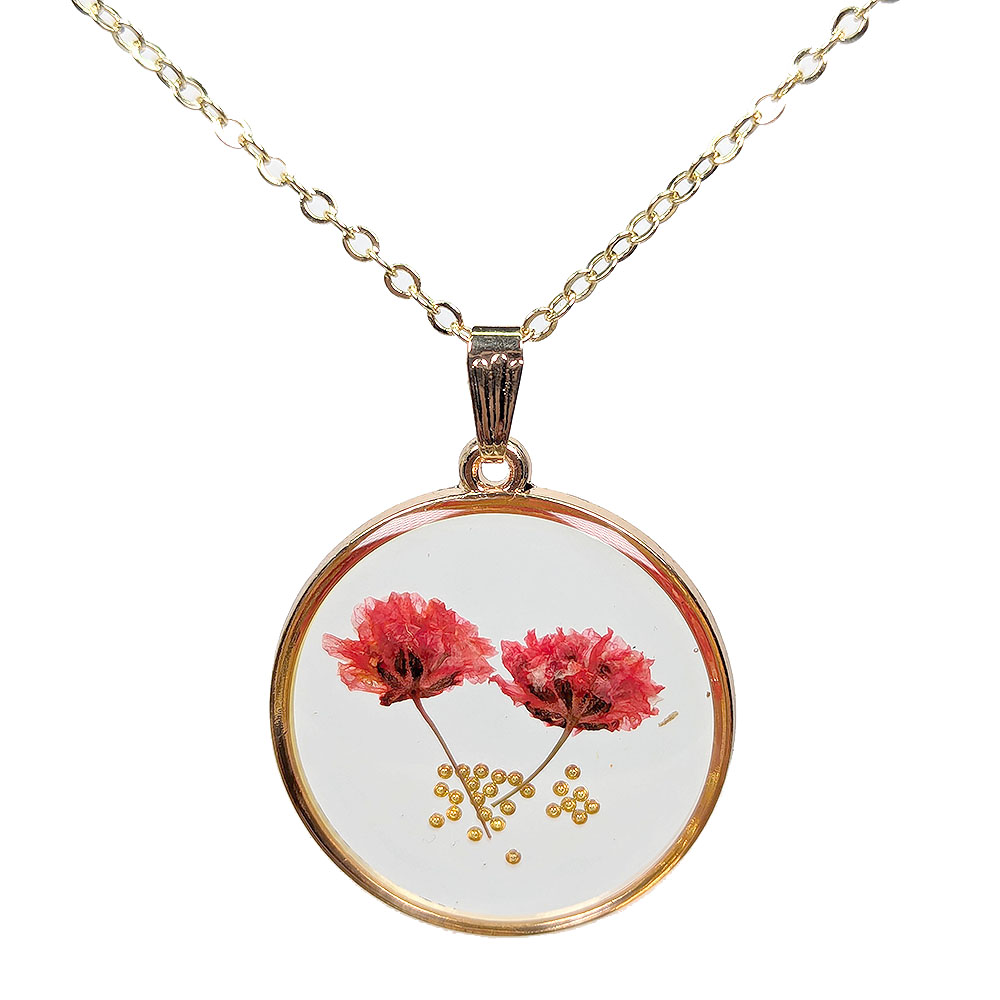 Round Red Real Dried Flowers Gold Beads Necklace
