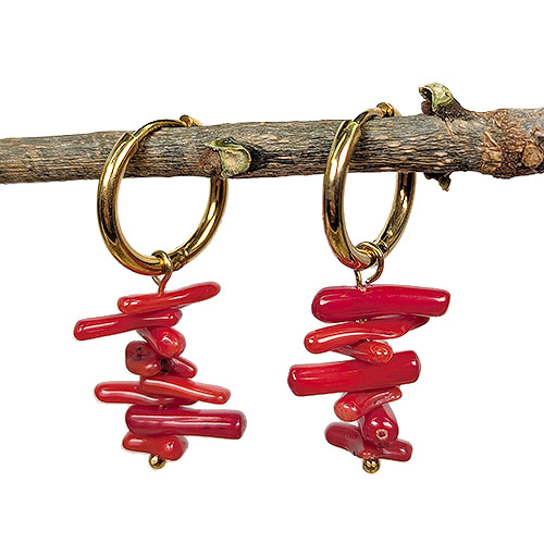 Stainless Steel Huggie Hoop Red Coral Gemstone Chunks Earrings