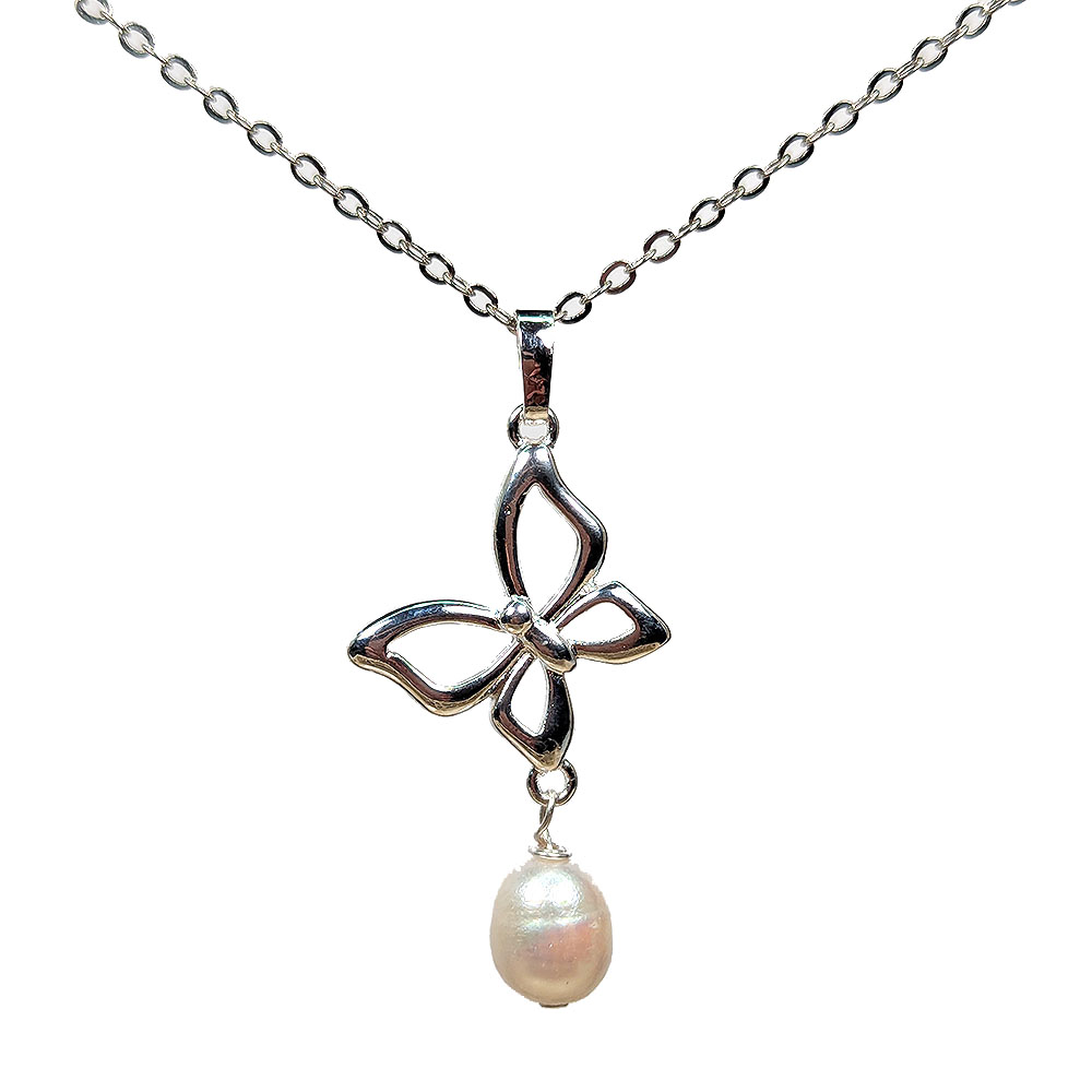 Sterling Silver Hollow Butterfly Freshwater Pearl Necklaces 18″