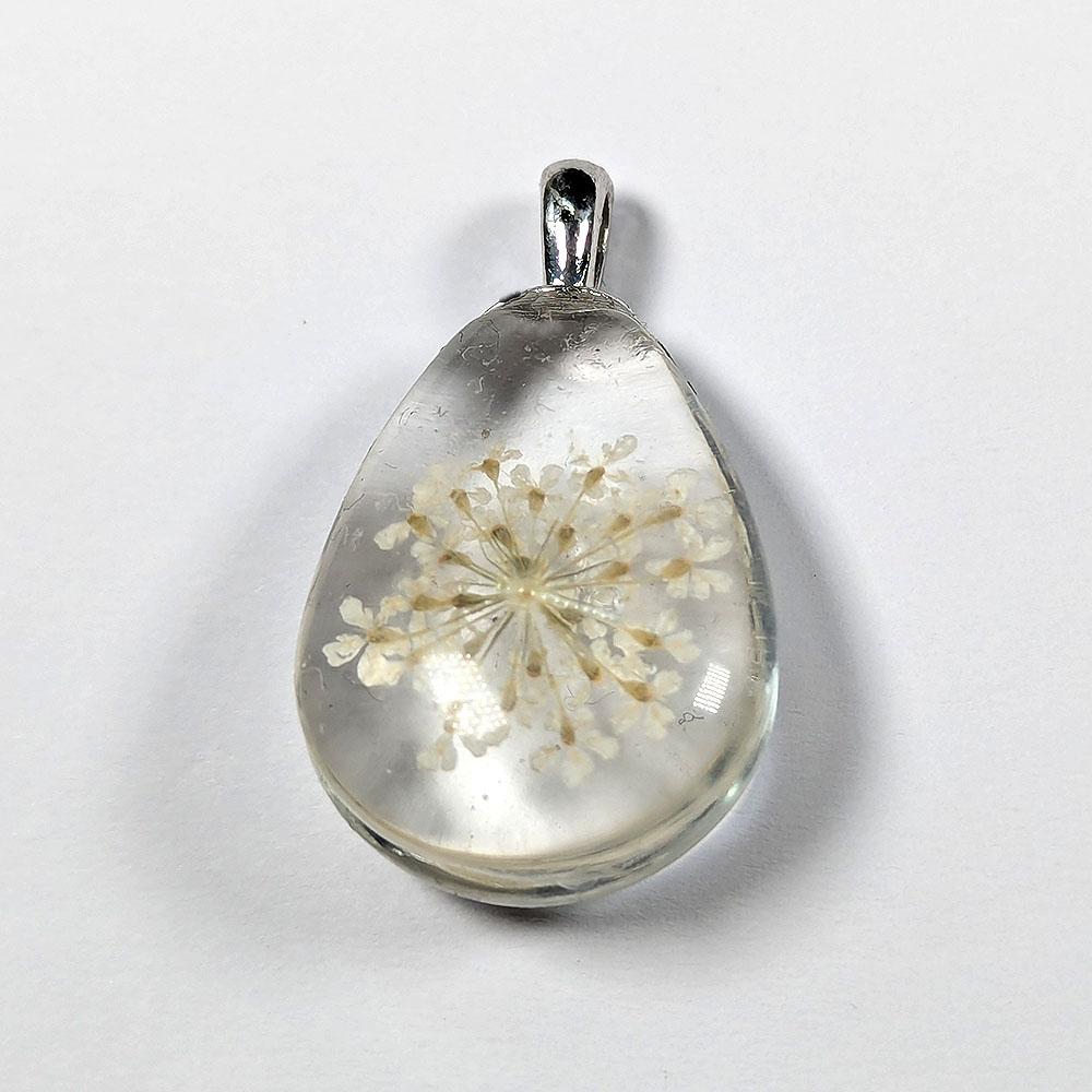 Teardrop Real Dried White Flowers Resin Pendant Silver